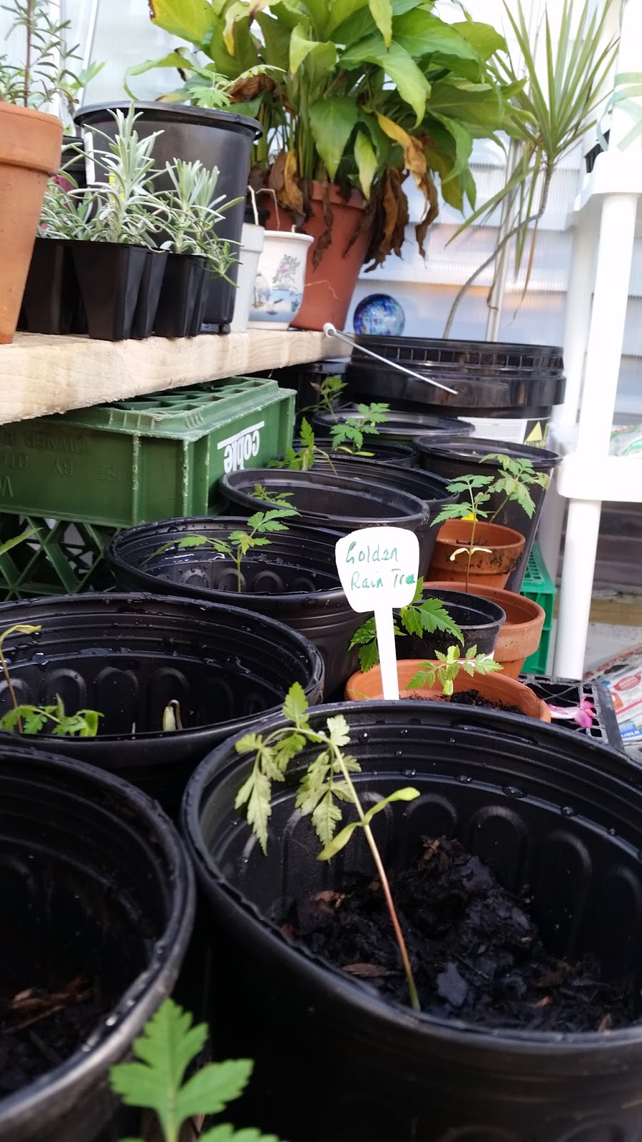 Harvesting and planting Goldenraintree seedlings worked far better than I thought, and the seedlings have thrived in the greenhouse. Some are now 6 inches tall, while others just sprouted within the past few days. As I didn’t anticipate so many of the seeds germinating, I put 2 – 3 seeds in each 1″ by 1″ compartment and ended up with zero to three seedlings in each tiny space. I was reluctant to disturb them at this time of year, but roots were already shooting out of the bottom of the pots and leaves were competing for light. I was really worried about the bare roots below the pot and the thin layer of soil between the roots and the environment as we do not yet know how the greenhouse will perform when temperatures really drop, so I decided to transplant them into bigger pots.