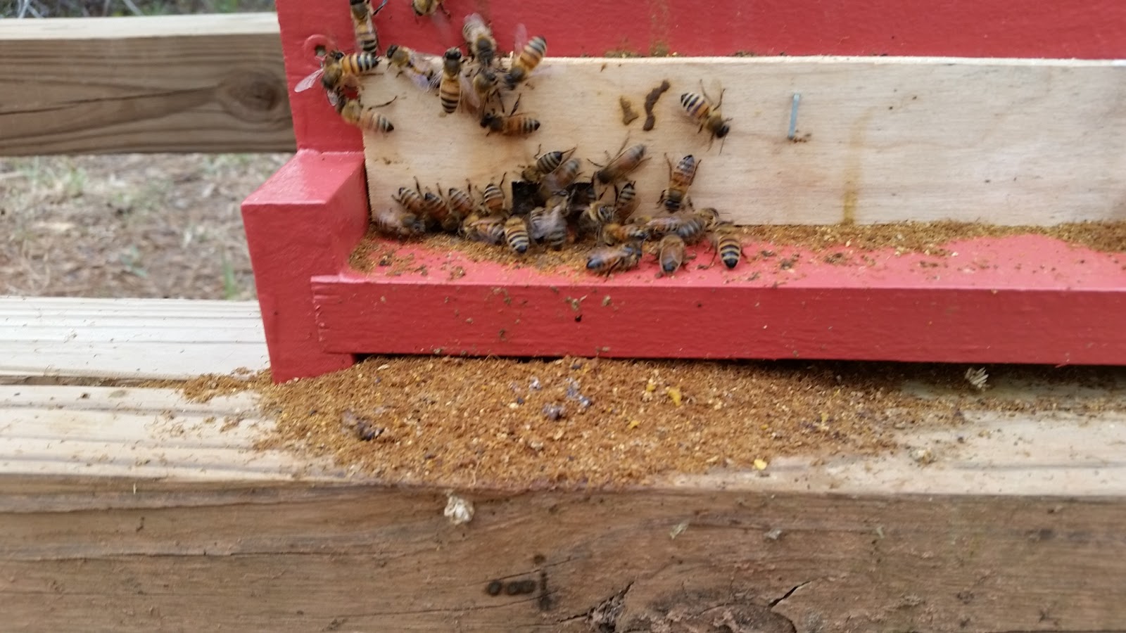 On the day hubby returned to the city to check on our new hives, I walked down to BIL’s hives between rain storms and saw something that looked like a cross between sawdust and the orange peel that comes in spice jars piled up around the front of one Nuc and even seeping out around the rest of the entrance reducer. We had looked at all the hives together the prior evening, refilled the top feeders, and even looked in a few hives at BIL’s request as he was out of town on business and concerned about a couple of them. So I knew that this was something new, but there was good traffic in and out of the hive, loads of pollen was coming in, and the bees didn’t seem in the slightest upset.