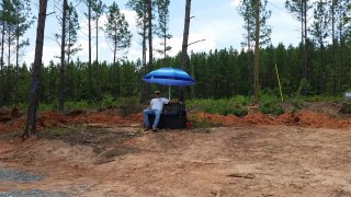 droopy, but this afternoon it started to rain. We bought a bench and a beach umbrella a couple of days ago, and when the rain started we sat in what I have dubbed the redneck living room and listened to the rain fall in our woods and on the umbrella. We stayed there until the rain soaked through our jeans and just enjoyed the sounds of the rain and the birds. Once our jeans were so wet that we couldn’t bend our legs, we decided to head back to the RV where we have continued to listen to the rain for the past 4 hours.