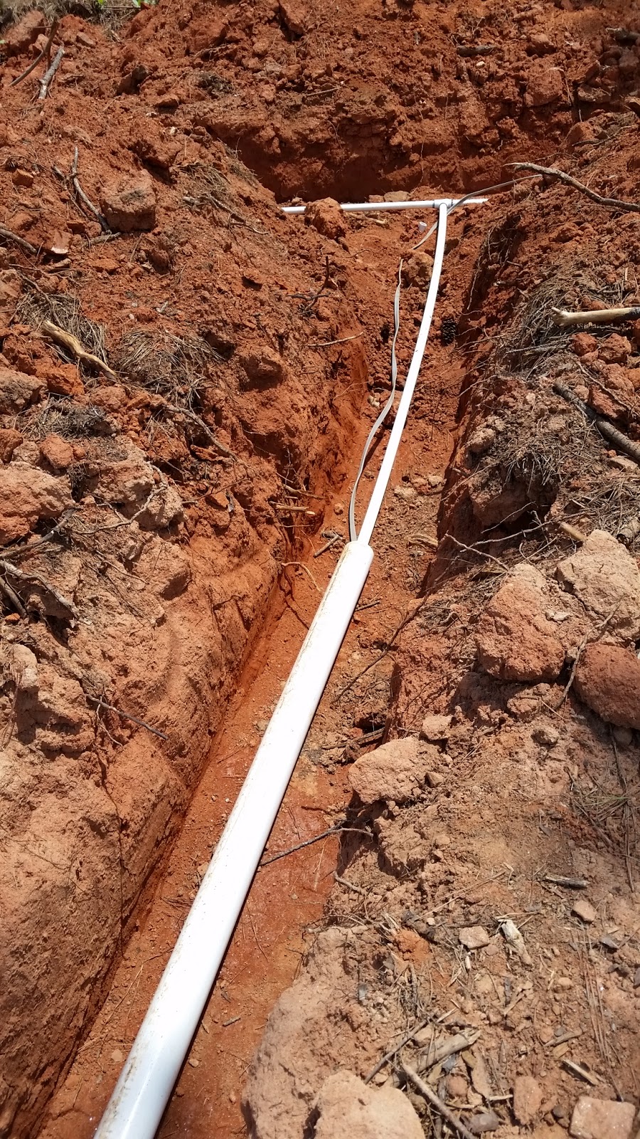 BH suggested that we feed our water and power line to the well through a larger piece of PVC pipe in order to protect it some from the pressure of us driving across the section that runs under the driveway. Most of the damage he sees to underground pipes stems from rocks abrading the plastic and that is more likely to happen under a heavily traveled area. Other suggestions that he made were to wrap the pipe in caution tape and tie wrap the electric line so that it stays under the pipe. That way, if we forget where the lines are and start digging, the first thing we’ll hit is the water and that’s only if we don’t notice the caution tape. The next step was to rake soil around and under the pipes so that when we backfill the trenches, the pipes are supported and the soil immediately around them is clear of rocks. That was my main job today, and I only got a short run finished. Guess what I’ll be doing tomorrow?