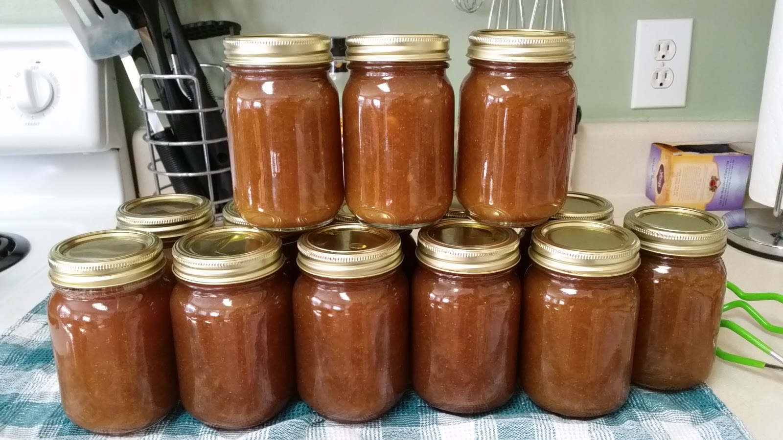 We had planned to take it easy last night, but the fig tree had other ideas! We arrived home shortly after 4:00 p.m. after driving through a thunderstorm only to find our sub-division bone dry and a fig tree weighed down with beautiful, ripe figs. We picked 15 pounds of figs in about 20 minutes, and our restful evening turned into making jam until 9:30 p.m.. I quickly loaded the dishwasher with jars to sterilize, and got to chopping and stirring. Hubby measured the sugar and we loaded everything into the new 18 quart pot. It is only logical that it takes a whole lot longer to bring that much jam to a boil than my normal 2 – 3 pounds of figs, but it turned out well in the end. Well, it turned it okay — I underestimated the number of jars I needed, so we have plastic containers of jam in the fridge for our consumption. We ran out of jam by Christmas last year; I don’t think that will be a problem this year. I am going to attempt fig jelly with the next batch, which will probably be tomorrow. My mom wouldn’t have been able to eat the jam with all the seeds, so I want to experiment with some seed-free varieties.
