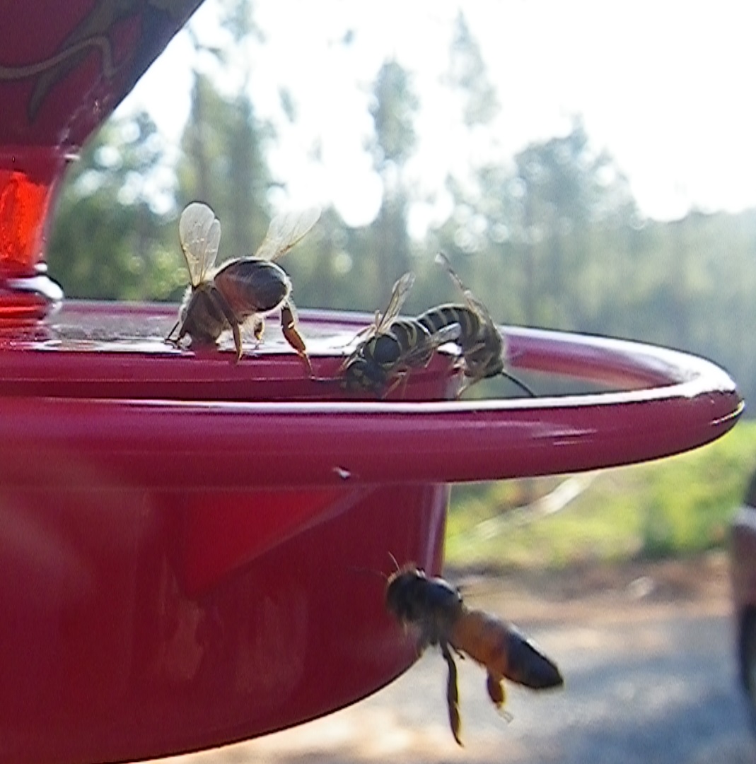 As soon as we arrived at the farm on Friday, the hummingbirds started chattering and darting around the almost empty feeder. We originally thought there was one pair nesting close to our RV, but there are far more than that. We so enjoyed watching their antics just a few steps away from our porch that I bought two more feeders on Saturday. We put them out as soon as we returned home, but the hummingbirds were clearly distrustful of the new feeders Saturday evening. I hoped to see hummingbirds on every feeder Sunday morning, but our bees renamed them bee feeders! I guess hummingbird syrup is just as sweet as sugar water! It didn’t matter to the bees that they have their very own 5 gallon bucket of sugar water just around the corner from the hives or that they were uninvited guests at the RV. I initially thought there was a mosquito in the RV when I was making coffee, but it turned out to be the bees we could hear buzzing around outside talking about these new red, plastic flowers that appeared overnight! They then moved right in and chased the hummingbirds away. However, they were unable to reach the nectar in one feeder once all the spilled sugar water was gone, so they eventually moved away and left that one for the birds.