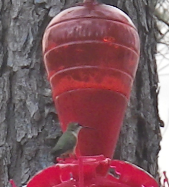 However, they very quickly took ownership of the new feeder with a flat top. Not only did they clean up leaking syrup from a gap between the lid and the top, they were able to stick their probosces through the holes and drink to their hearts’ content. They were still their guzzling away when we left at lunchtime. Luckily for the hummingbirds, no bees or wasps were interested in the 99 cent feeder, so the birds ended up with two feeders to fight over. And fight they did. I’ve always wondered how hummingbirds survive when they seem to spend more time being territorial than drinking. There are four perches on the original feeder — why can’t they just get along and hang out together?
