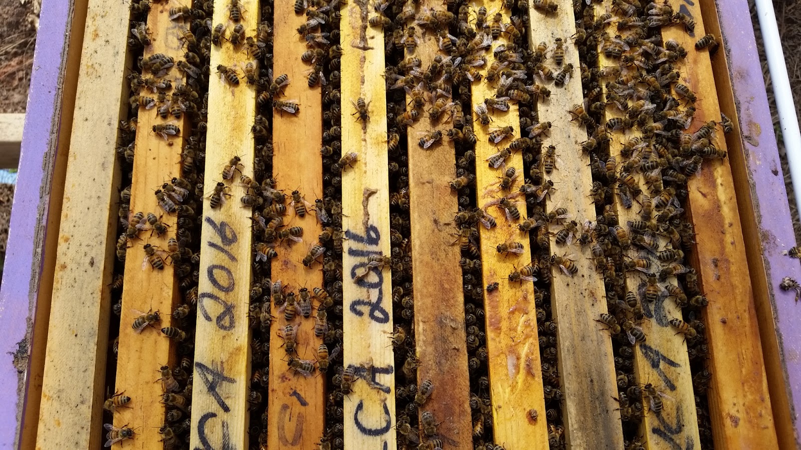 Our city hives came through the most recent cold snap well. Only a few were using the feeder buckets last weekend, but the buckets were crowded yesterday. Once it warms up, I’ll put hive top feeders back on our new NUCs so that they can rebuild their stores. The first swarm capture was a little low on bees last weekend, and we had queenless and broodless bees in one of the queen castle sections. We combined them by stacking a second NUC body on top of the first and adding the lonely bees so that they could keep the beautiful new brood warm and have a queen to worship (or boss around.) The NUC with the bees from the second swarm capture had 3 full frames of bees last weekend and the queen was busy searching cells. There wasn’t any capped brood last weekend, and I have a hard time seeing eggs with my bi-focals and the veil, but she’s healthy and active so we expect to see something when we do our next check.